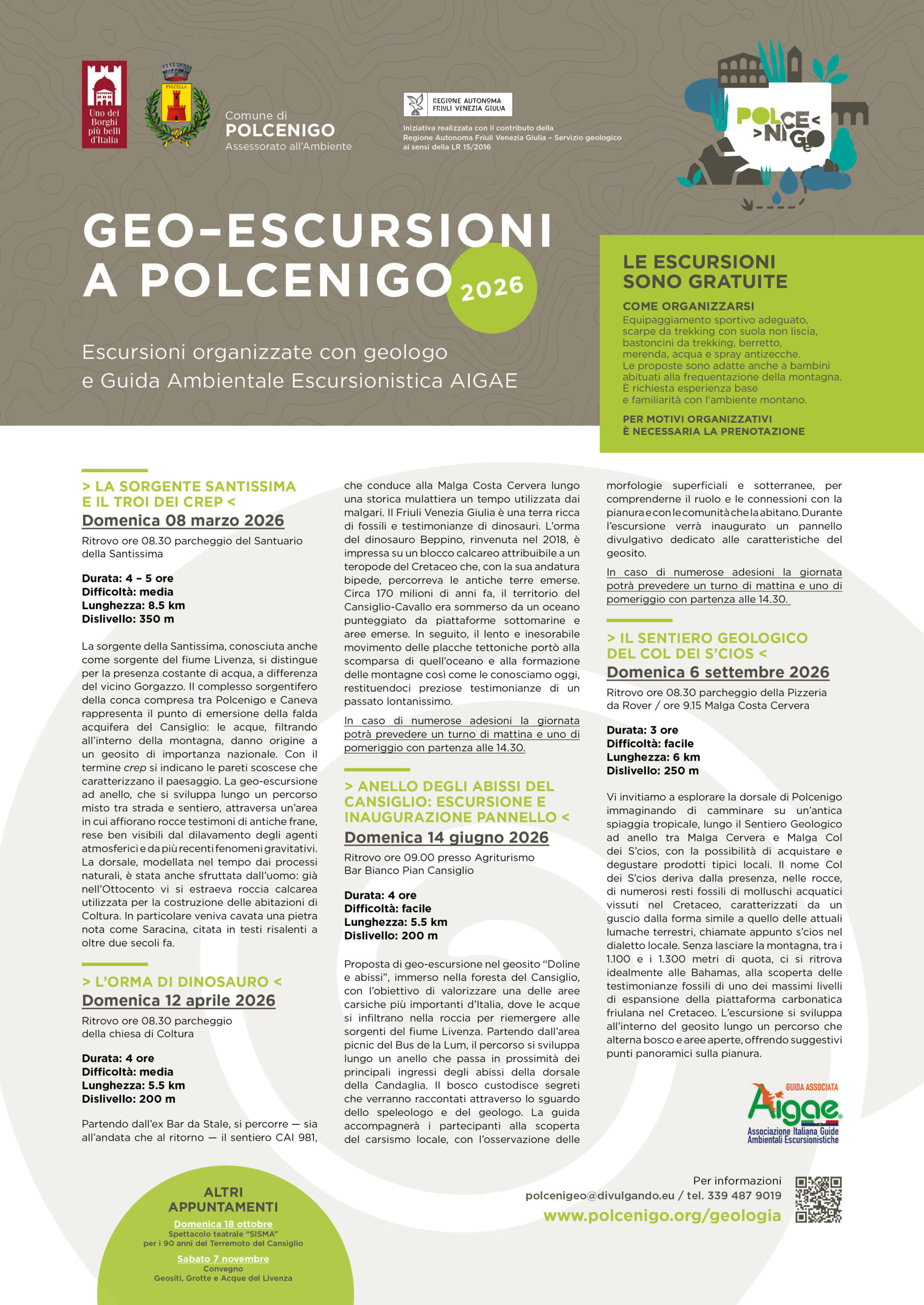 Il Comune di Polcenigo custodisce un patrimonio geologico di valore straordinario, parte integrante dell’identità locale e risorsa fondamentale per il turismo, l’economia e la cultura del territorio. Due geositi ufficiali — le Sorgenti del Fiume Livenza e il Complesso di scogliera del Col dei S’cios — sono inseriti nel Catasto Regionale dei Geositi del Friuli Venezia Giulia per la loro rilevanza geomorfologica, idrogeologica e paleontologica. A questi si aggiunge la celebre “Orma di Dinosauro”, ritrovata nel 2018 lungo il versante tra Mezzomonte e Candaglia, oggi divenuta un punto di grande interesse scientifico e turistico.